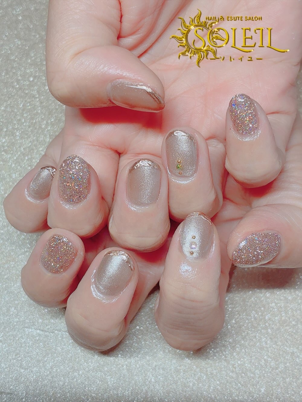 マグネットベージュに 爪先キラッとブロンズミラーライン✧˖°