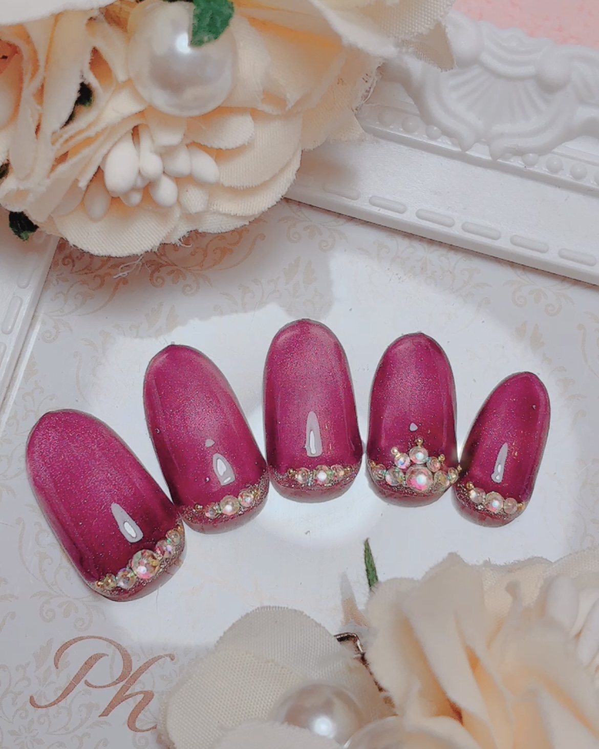 ショートネイルでも指長に見せる縦長マグネットネイル✨️大粒ストーンで、華やか上品に❁⃘*.゚