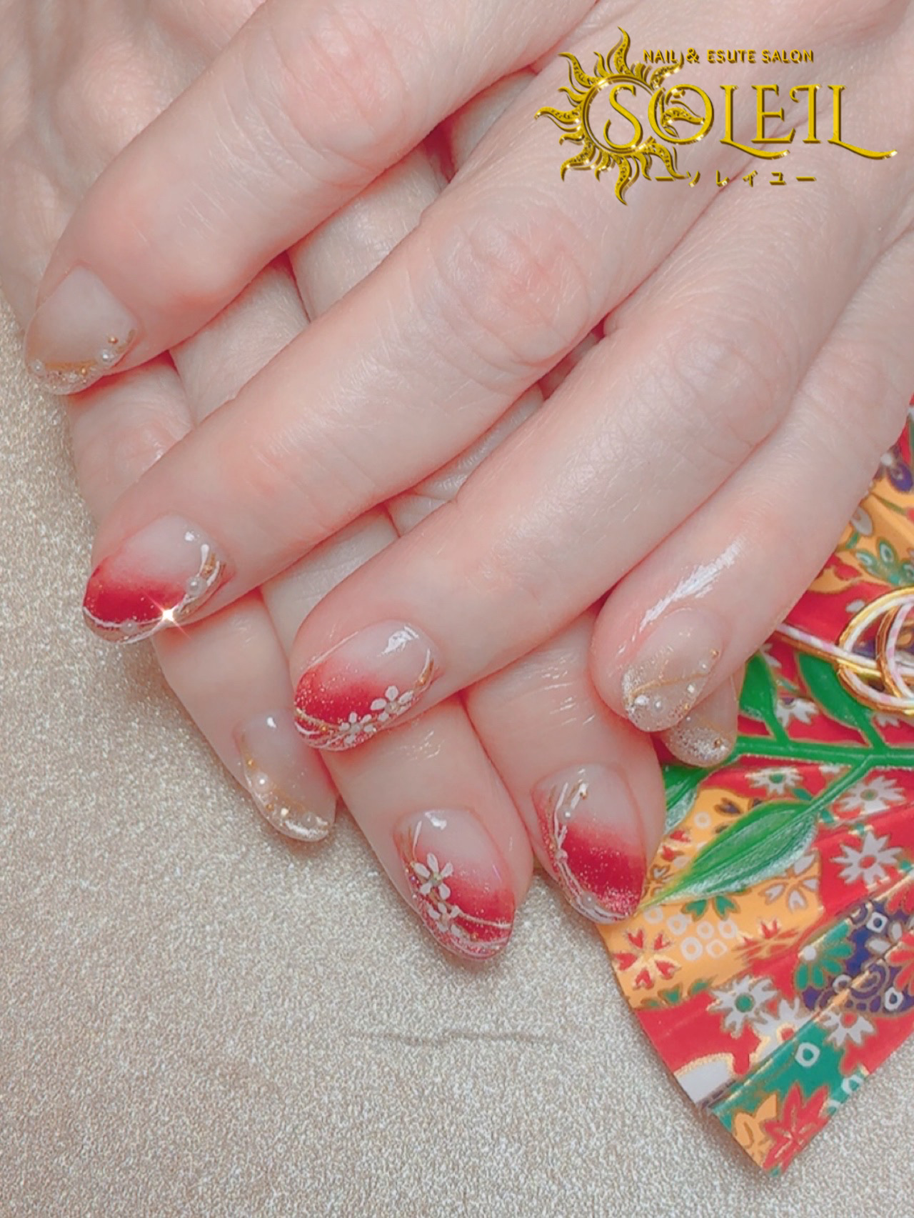 赤いマグネットの グラデネイル❤️✨ きらっと輝く指先に 水引きと小花で可愛さプラス🌸