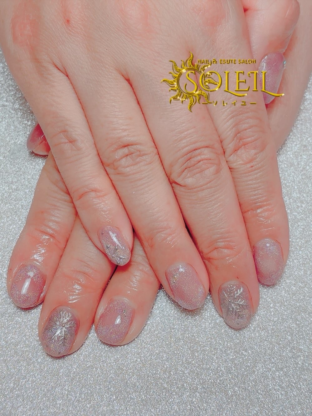 雪の結晶ネイル❄️ 優しいピンクベージュに 華奢ラインがキラキラ✨