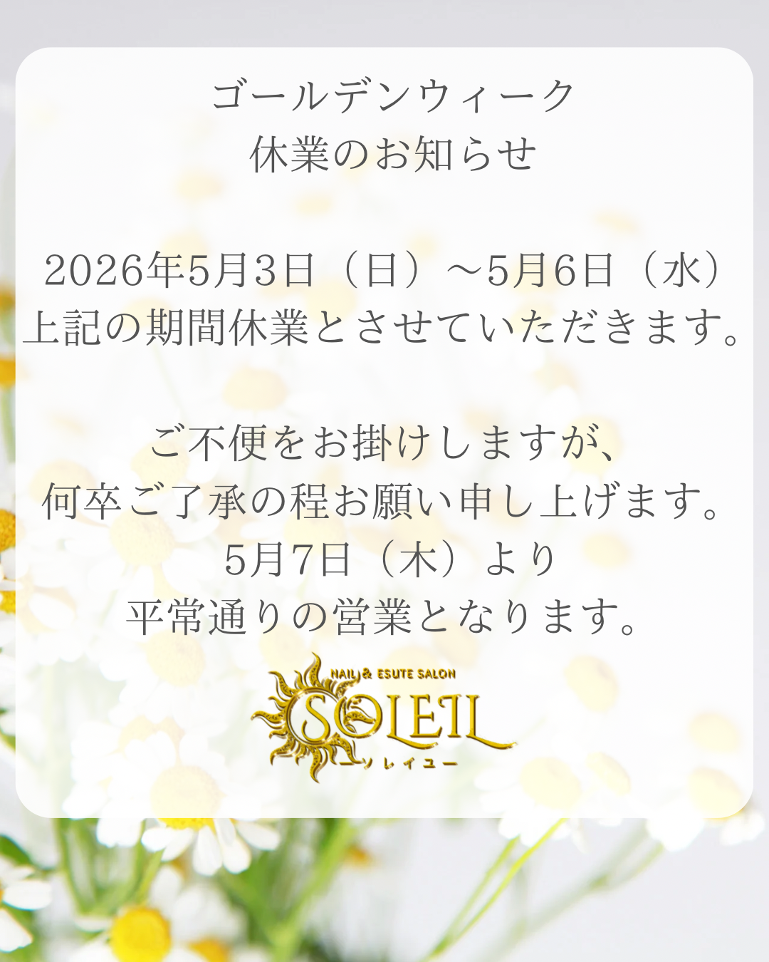 2026年5月3日(日)〜5月6日(水)の期間休業とさせていただきます。 ご不便をお掛けしますが、何卒ご了承の程お願い申し上げます。 5月7日(木)より平常通りの営業となります。